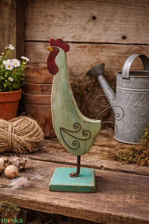 Fából készült festett rusztikus, antikolt kakas fatalpon