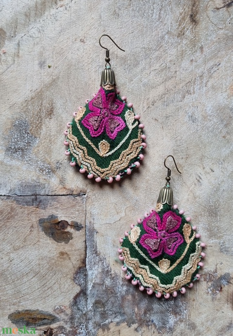 Marokkó- hímzett fülbevaló méregzöld/pink/fehér