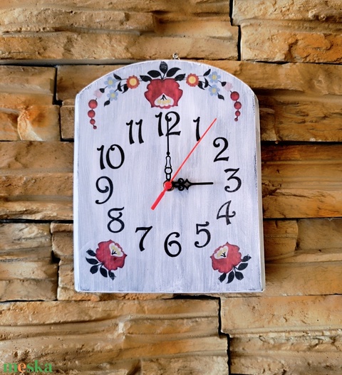 Vintage stílusú fa falióra kalocsai mintával díszítve