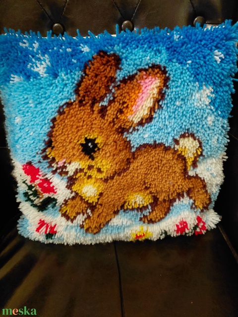 Horoghorgolással ( suba) technikával készült nyuszis párnahuzat. Hátul középen cipzárral záródik. Mérete: 45cm× 45 cm.