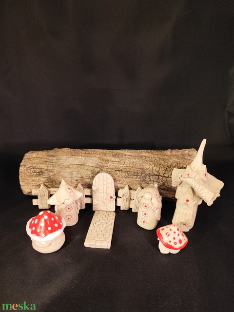 Fehér agyagból készült, 1x égetett , 9 részből álló tündérkert. Barna kerámia mázzal van bemosva , majd égetés után akril festékkel van színezve és lakkozva.