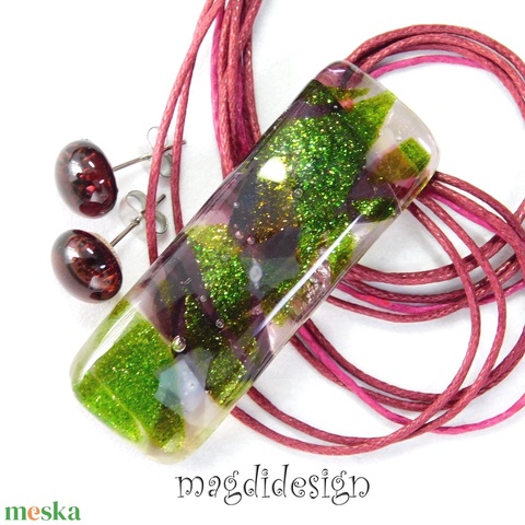 Csillámos bíbor-zöld üvegékszer szett nyaklánc stiftes fülbevaló