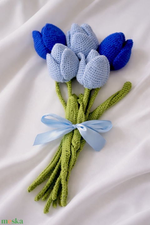 Kézzel horgolt tulipán csokor finom kék árnyalatokban (világoskék és királykék).