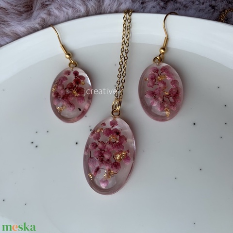 Rózsaszín virágos epoxy ékszerszett – valódi virágos nyaklánc és fülbevaló