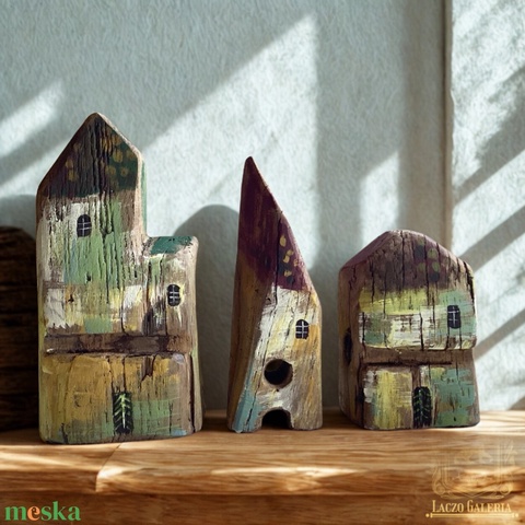 Tölgyfa Város - Könyvtámasz - Tölgyfa - Polc dísz, Faházikó - Ajándék ötlet, Rusztikus Dekoráció, Ház, Házikó 3 db.