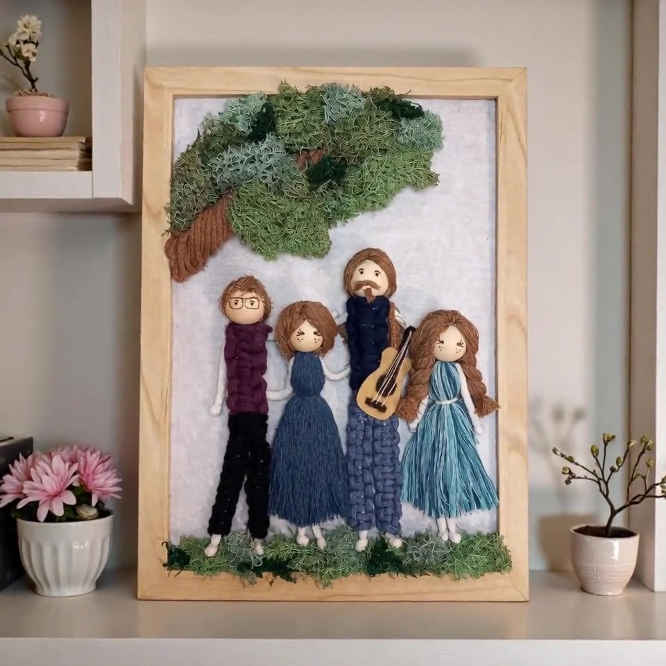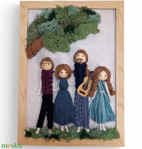 Személyre szabott családi fonalkép fa keretben – makramé portré 3D falikép, egyedi ajándék