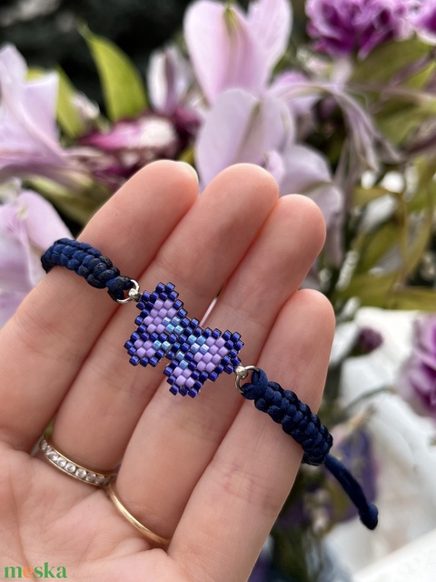 Fonott karkötő sötétkék- világoslila gyöngy pillangóval