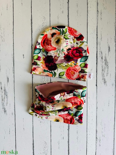 Rózsás virágos sapka-sál szett (50-52)