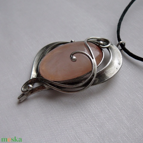 A medál Tiffany technikával készült rózsakvarc és ólommentes, ezüsttartalmú ón felhasználásával. A díszítés szintén saját készítésű, nem tartalmaz gyári elemeket. A fémrészt óezüstre patináztam és lelakkoztam, hogy sokáig szép maradjon.