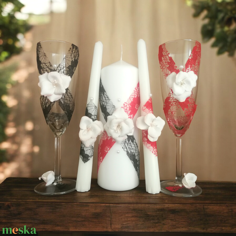 - Anyag/Összetevő üveg pezsgőspoharak, gyertyák, szintetikus agyag, ragasztó, csipke, gyöngy