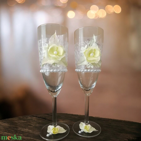 Egyedi esküvői pezsgőspoharak... agyagvirágokkal díszítve !
