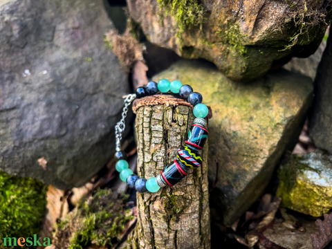 Viking kori leletek alapján készült replika üveggyöngyökkel fűzött, kézműves karkötő állítható fém lánccal. A központi üveggyöngyöket konkrét lelőhelyhez kötve kombináltam az adott ásványokkal.