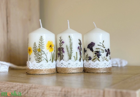 Szárított virágos gyertyák 3 db ajándékcsomag DÍSZDOBOZBAN- Csipkével jutazsinórral díszítve
