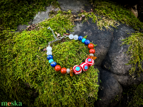 Viking kori leletek alapján készült replika üveggyöngyökkel fűzött, kézzel összeállított karkötő állítható fém lánccal. A központi üveggyöngyöket konkrét lelőhelyhez kötve kombináltam az adott ásványokkal.