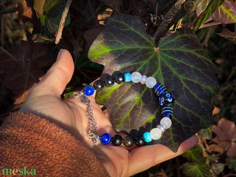 - Lapis lazuli: mély, királykék kő, amelyet gyakran kötnek méltósághoz, bölcsességhez és őszinte kommunikációhoz. A karkötőben a középső világot (Midgard) erősíti. Azt a teret, ahol emberként állsz a föld és az ég között, és felelősséget vállalsz a saját szavaidért, döntéseidért.