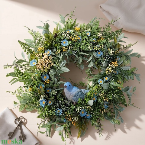 Kék virágos tavaszi koszorú - kismadárral, természetes hatású