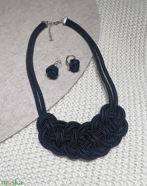 Vízfodor nyaklánc és Franciakapcsos Szeder fülbevaló zsinórékszer szett, kézzel csomózott, fekete