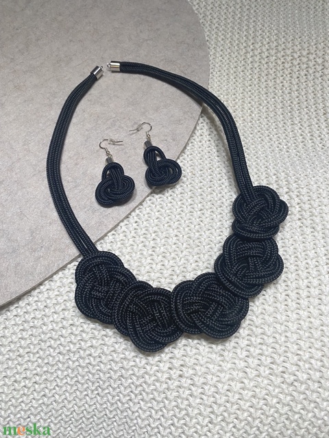 Virágos nyaklánc és lógós füge fülbevaló zsinórékszer szett, kézzel csomózott, fekete