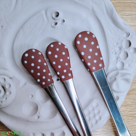 A kép egy készletről készült. Az újabb készlet feltöltések során némi eltérés lehetséges a pöttyök elhelyezkedését illetően, mert mindet egyenként helyezem a nyelekre, amihez nem használok sablont. A pöttyök mérete mindnél azonos.