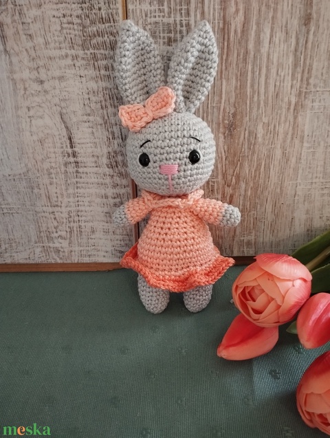 Szürke horgolt nyuszilány - Barackszín szoknyás