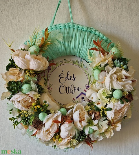 Húsvéti kopogtató / ajtódísz horgolt pólóalapon selyemvirágokkal és fatáblával menta színben