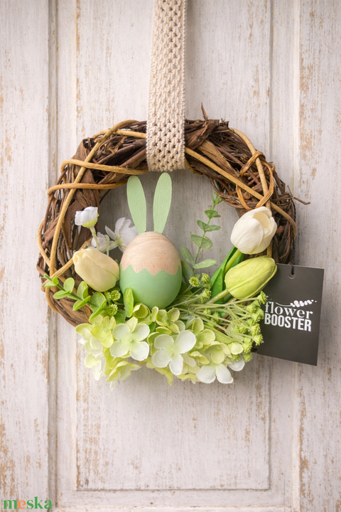 Húsvéti ajtódísz barna háncs koszorún fa nyuszival