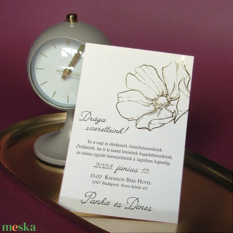 Letisztult, minimalista, trendi, plusz van benne valami különleges - ha egy csepp csillogásra vágysz. Esküvői meghívó egy nagyméretű, modern virággal, melyet aranyfóliázással emeltem ki.