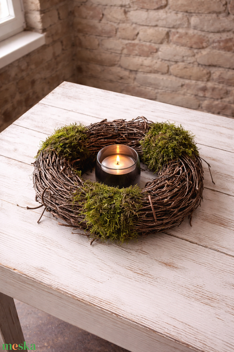 - Anyaga: szalmakoszorú, nyírfaág, moha, drót, mécses
