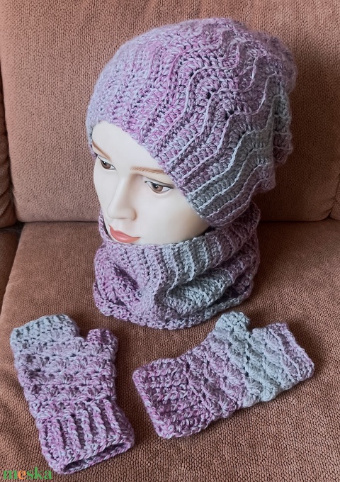 3 részes lila-szürke horgolt szett, sapka, csősál és kézmelegítő