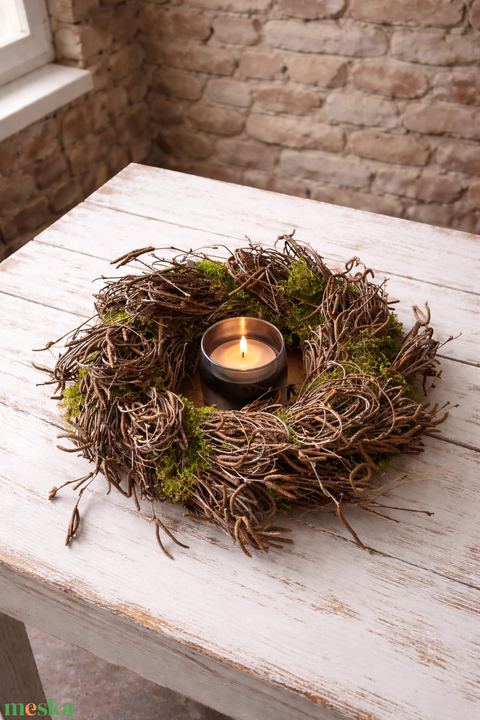 - Anyaga: szalmakoszorú, nyírfavessző, moha, drót, mécses