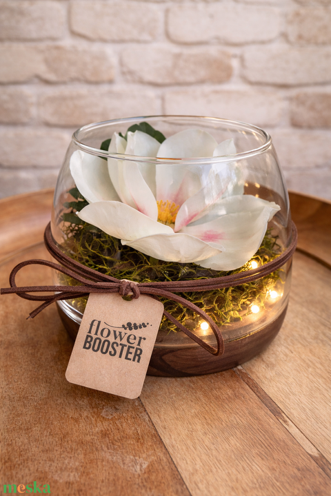Magnólia üvegtálban fa talpon Nőnapra ledfénnyel