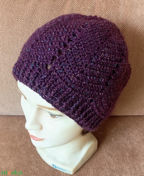 Horgolt női női vagy tini sapka padlizsánlila, színes irizáló szálas fonalból