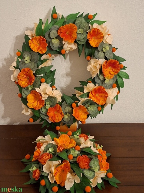 - Anyag/Összetevő szőlővessző alap, prémium virágok, pompomok, hortenzia, eukaliptusz, zöld levelek, narancsszín virágok