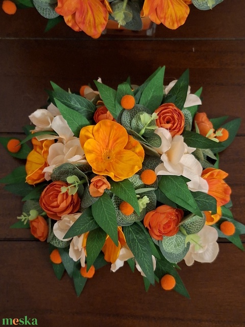 - Anyag/Összetevő porcelántál, zöld levelek, eukaliptusz, hortenzia, apró pompomdíszek, narancsszín virág, narancsszín rózsák