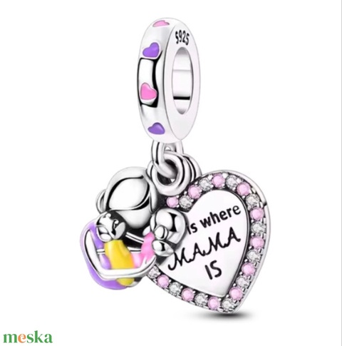 Ezüst függő charm – szív medállal, anya, mama