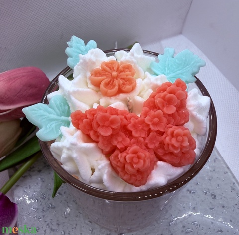 Pillangós üveges dìszgyertya, virággal és kis levelekkel