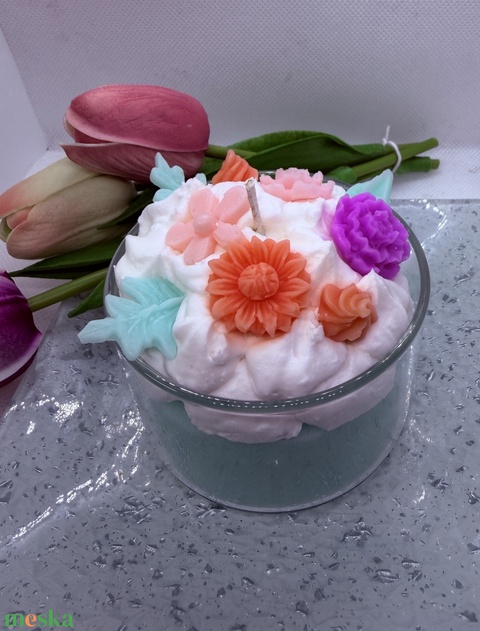 Apró virágos üveges dìszgyertya - menta zöld alappal