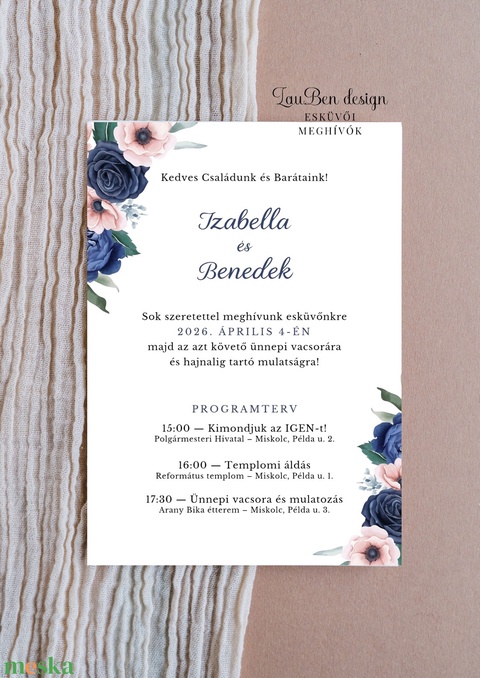Sötétkék-púder akvarell esküvői meghívó – elegáns virágokkal és programtervvel