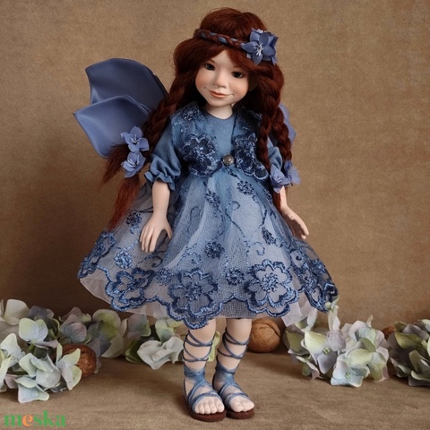 SZILFIN - kék csipkés porcelán tündér, mozgatható