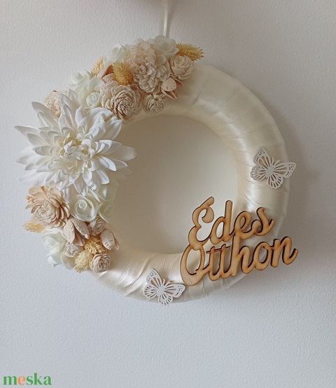Krémszínű selyemszalaggal bevont polisztirol alapra készült tavaszi kopogtató.