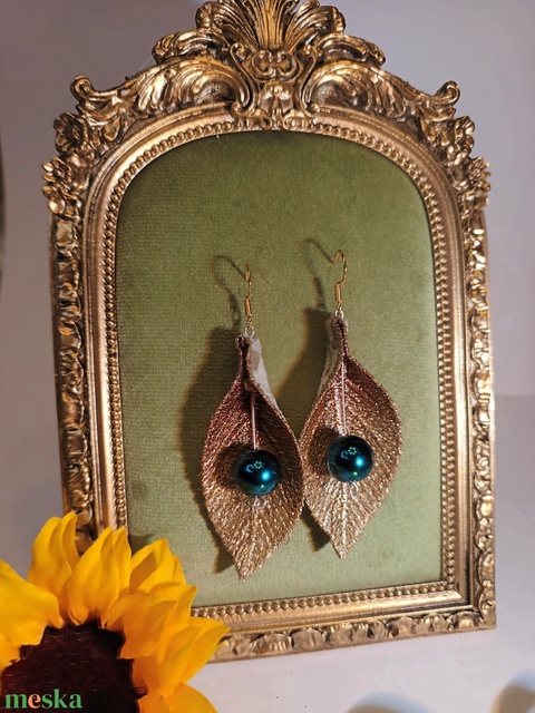 Kézműves arany levél fülbevaló elegáns tekla gyönggyel