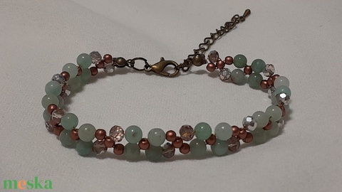 Cseh üveg gyöngyökből, csiszolt gyöngyökből drótra fűzött karkötő delfinkapoccsal és hosszabbító lánccal. A gyöngyös rész hossza 17 cm.