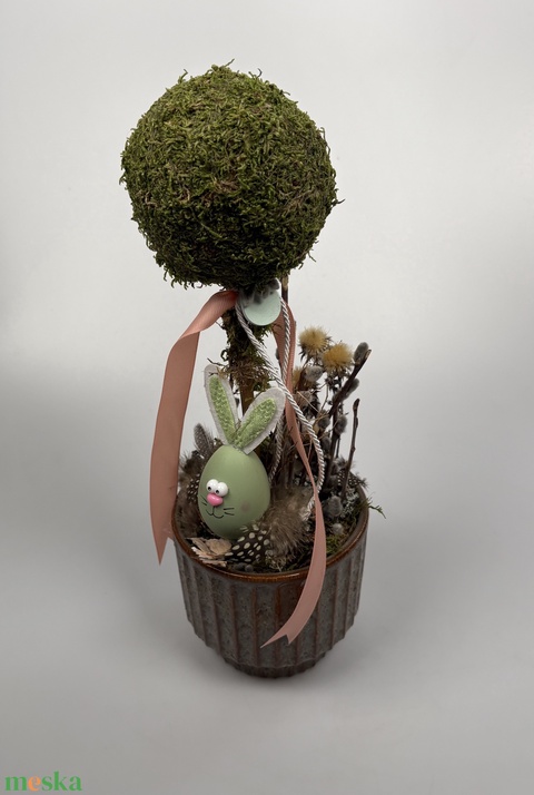 Mézi - Fészkes, nyuszis, gömbfás asztaldísz szürke-mézbarna kaspóban, növényi részekkel és kellékekkel (P-01)