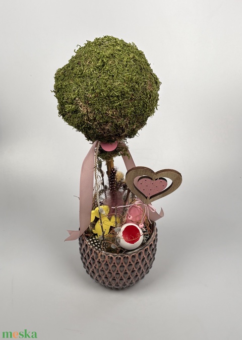 Rózsi - Szívecskés, nyuszis, gömbfás asztaldísz rózsaszín-szürke kaspóban, növényi részekkel és kellékekkel (P-02)