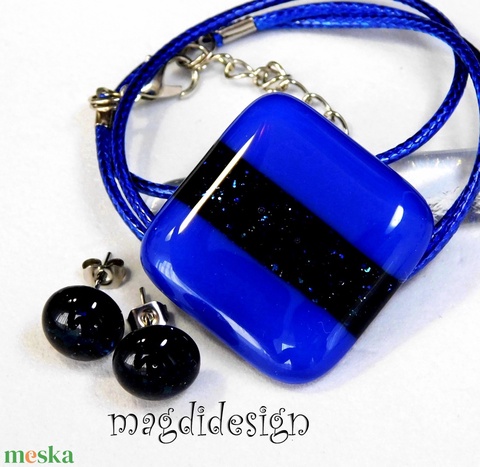 Király-kék aventurin csíkos üvegékszer szett, nyaklánc, pötty fülbevaló