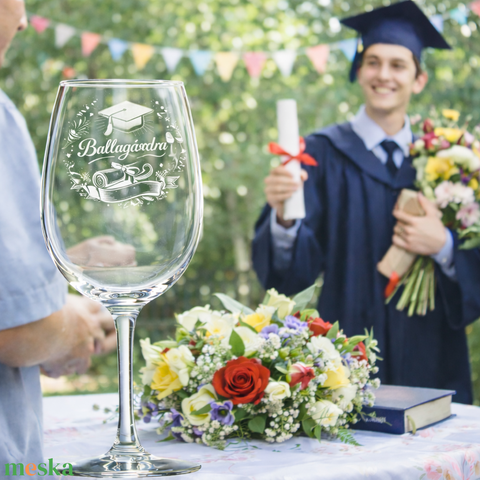 Elegáns, egyedi gravírozott borospohár ballagás alkalmára, amely maradandó emlékként őrzi a nagy nap pillanatait. A poharat a „Ballagásodra” felirat díszíti, klasszikus, ünnepélyes betűtípussal, kiegészítve ballagási motívumokkal: ballagó kalap, oklevél, ünnepi díszítések.