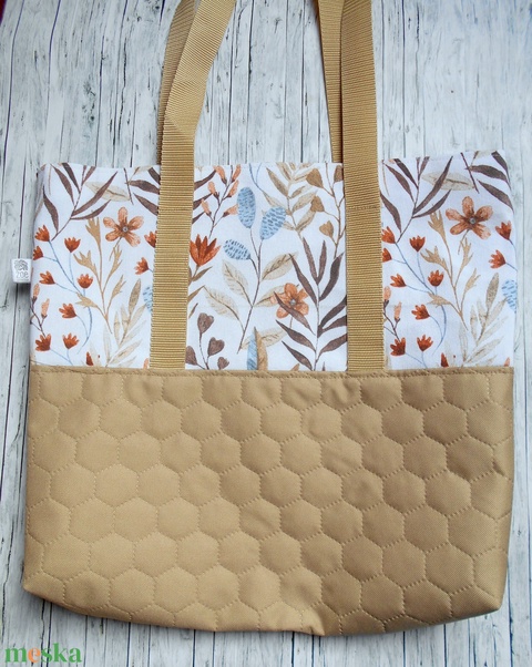 Nagyméretű beige, natúr alapon kék-beige-terrakotta levél-virág mintás válltáska