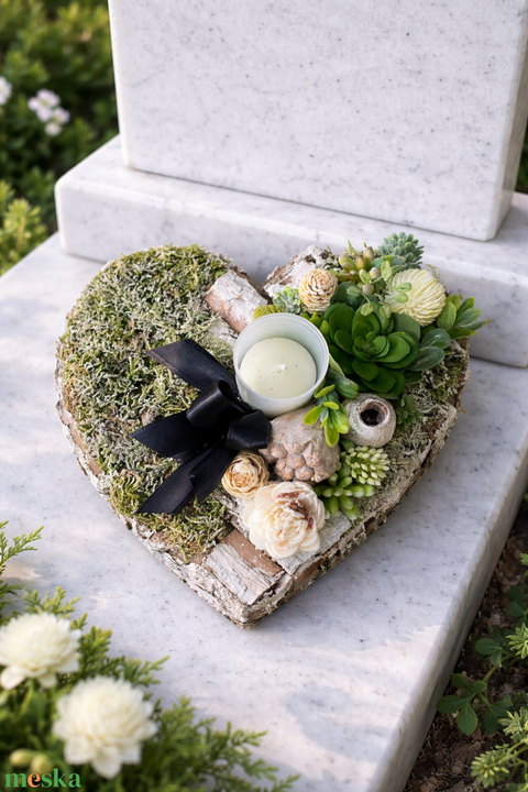 Szív alakú sírdísz gyertyával selyem és szárazvirágokból