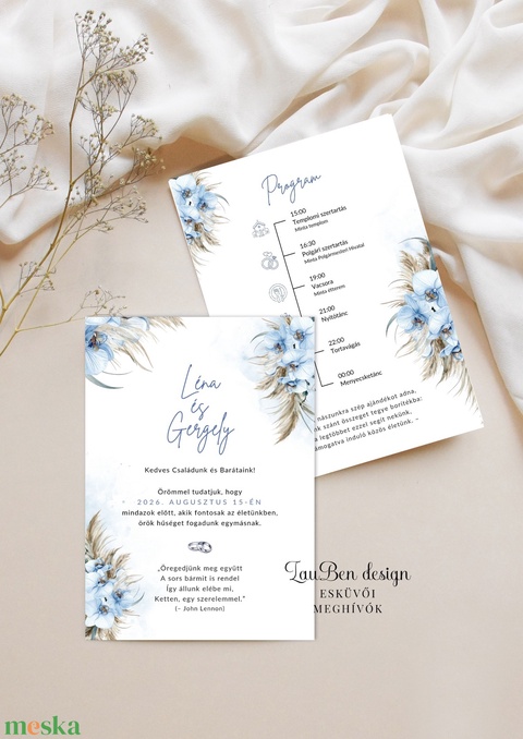 Kék orchideás és pampafüves esküvői meghívó – idővonallal