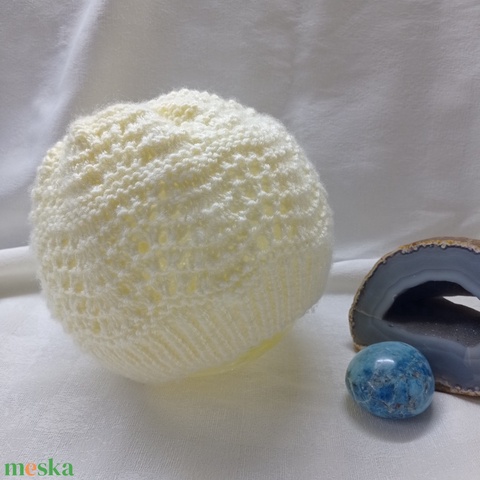 Fehér, csipkekötéssel készült, áttört kötött sapka
